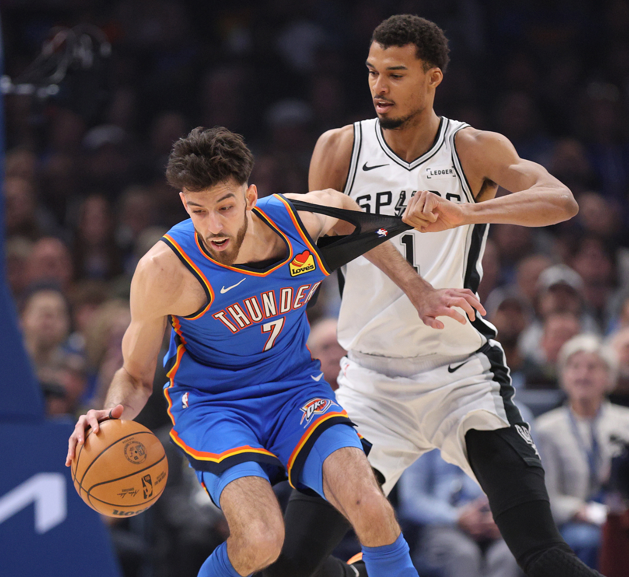 这是本赛季雷霆与马刺的第四次交手,前三次都是马刺取得胜利,联盟第一的雷霆极度想要挽尊完成复仇,开场两队拼防守就非常凶猛,文班亚马完成了隔扣霍姆格伦的大戏。SGA被贴防影响,好在卡森与威金斯分别命中三分。卡斯尔连拿五分回应,科内特两个前场篮板马刺都得分,米切尔突破得手,亚历山大造2+1马刺立马暂停,亚历山大再度命中反超,首节打完雷霆32-26领先马刺。