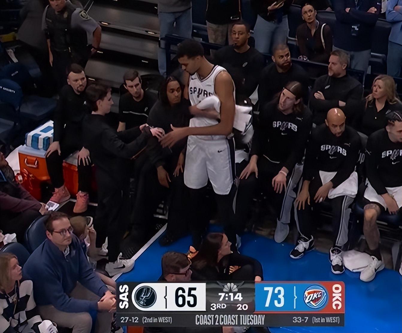 第三节亚历山大被文班亚马制造进攻犯规,文班亚马的膝盖被撞只能下场检查休息。