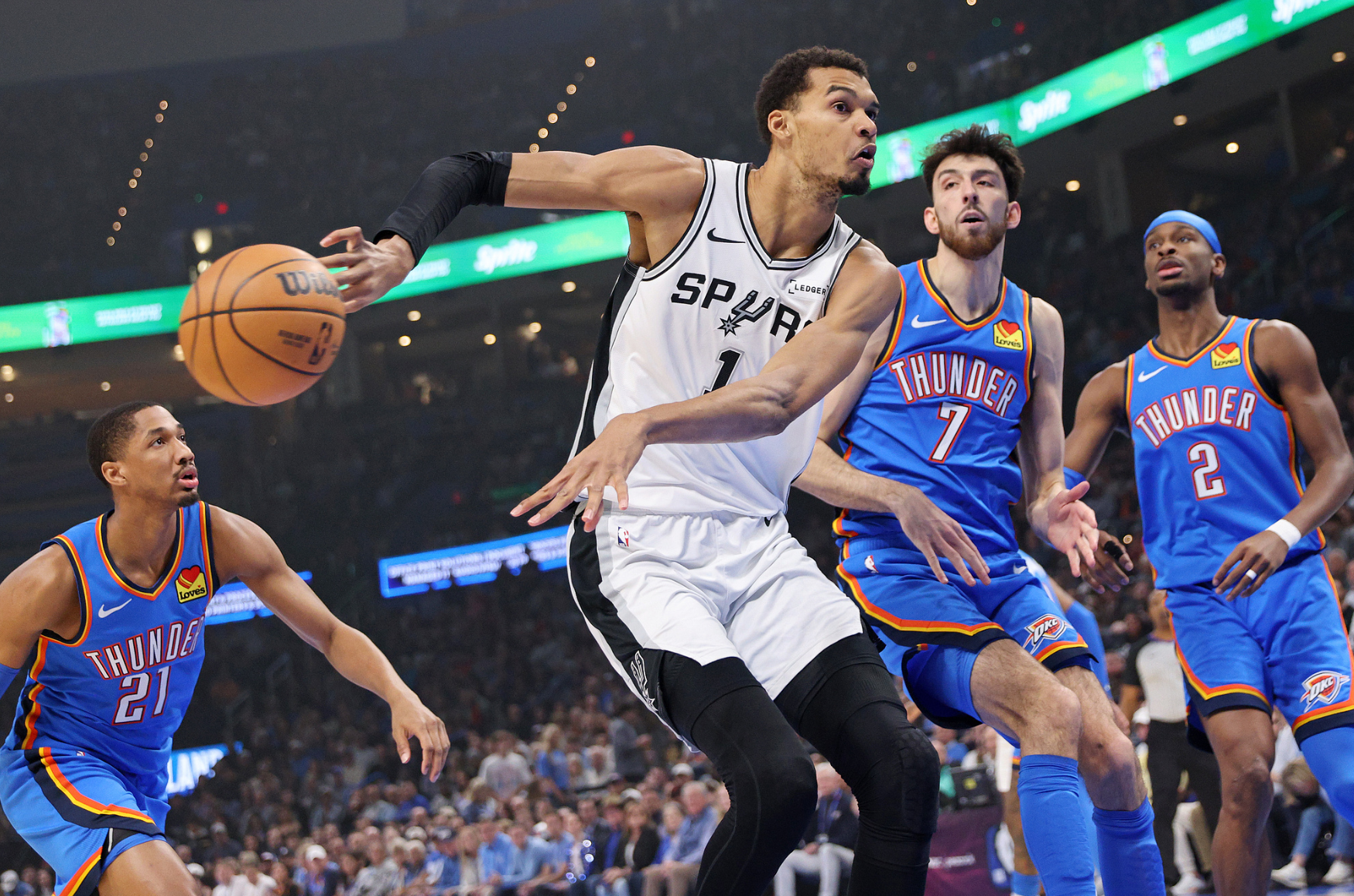 这是本赛季雷霆与马刺的第四次交手,前三次都是马刺取得胜利,联盟第一的雷霆极度想要挽尊完成复仇,开场两队拼防守就非常凶猛,文班亚马完成了隔扣霍姆格伦的大戏。SGA被贴防影响,好在卡森与威金斯分别命中三分。卡斯尔连拿五分回应,科内特两个前场篮板马刺都得分,米切尔突破得手,亚历山大造2+1马刺立马暂停,亚历山大再度命中反超,首节打完雷霆32-26领先马刺。